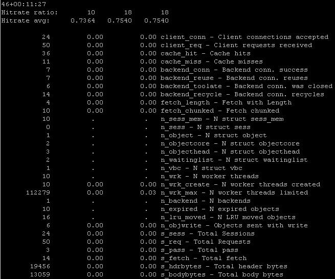 第一行顯示的是varnish自啟動到現在運行了多長時間,如上圖顯示的是45天0小時11分27秒第二行顯示的是啟動這個命令的時間,這個三數字最終會變為10,100,1000;分別代表10秒,100秒,1000秒第三行顯示的是命中率,分別對象上面的時間,分別是10秒內的命中率,100秒內的命中率,1000秒內的命中率從第四行開始下面的數據就分為4列第一列為總數值,第二列為每秒中的數值,第三列自命令(varnishstat)啟動以來的平均值,第四列是描述