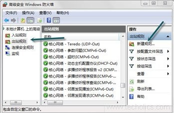 這時會打開一個叫高級安全Windows防火墻的窗口。在左邊選中出站規(guī)則,然后在最右邊的窗口操作下面點(diǎn)擊新建規(guī)則。