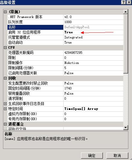 點擊應用程序池---右面的高級設置---“啟用32位應用程序”設置為true
