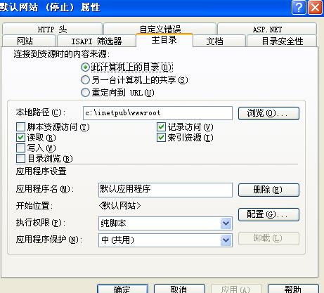 第三步,右鍵點擊在第二步看到的“默認網站(停止)”,然后在出現的對話框中選擇“屬性”,然后進入如上圖所示的界面,這個時候選擇“主目錄”。
