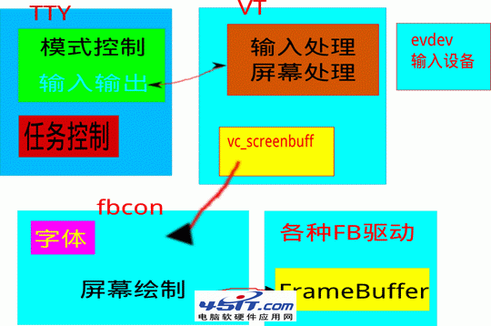 vc_sw 是個(gè)由控制臺(tái)代碼提供的指針,類型為 structconsw * , 控制臺(tái)驅(qū)動(dòng)的初始化部分會(huì)使用 vt_unbind() 將自己綁定為虛擬終端使用的控制臺(tái),傳入的信息中就包括 vc_sw。 在 vgacon 中 vc_sw->con_puts 事實(shí)上就是將要顯示的內(nèi)容簡(jiǎn)單的拷貝到 VGA 的字符緩沖區(qū)。對(duì)于 fbcon 而言則要復(fù)雜的多。 fbcon 提供的 con_puts 將 glyph 作為一個(gè)下標(biāo)在 vc->vc_font 中找到對(duì)應(yīng)的位圖數(shù)據(jù),然后拷貝到幀緩沖區(qū)。 TTY-> 虛擬終端 -> 控制臺(tái) -> 屏幕的路徑用一幅圖片表達(dá)為: