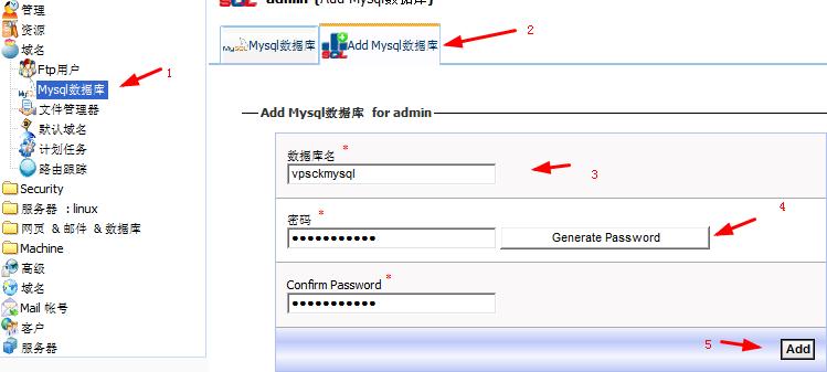 按圖片標的數字順序操作 第4步是系統生產密碼 當然你也可以自己設置如果是生產把密碼記錄下來 網站配置的時候需要用。