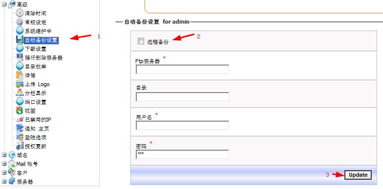 這都是中文操作我就不一步一步截圖了,看上圖的數字標識操作,先找到備份選項,設置備份字符,然后設置遠程FTP信息