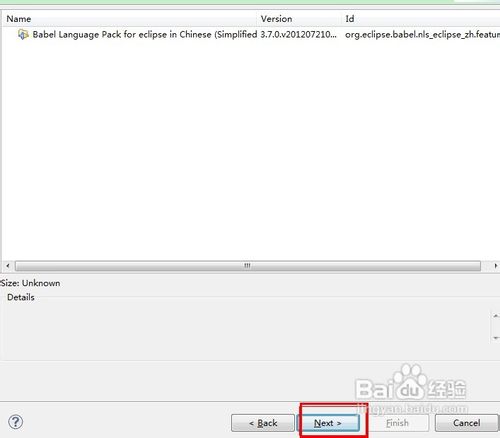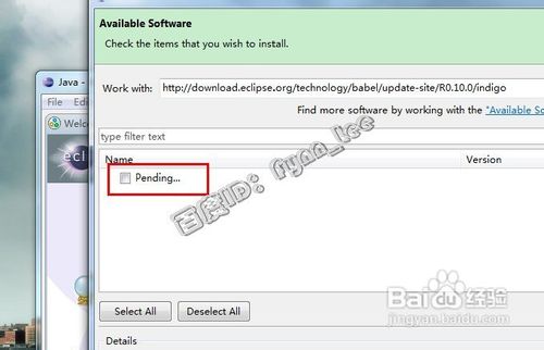 4. 此時看到“Pending...”即正在等待中,用戶等待片刻便會看到軟件檢索到的語言包列表,下拉垂直滾動條,選擇“for eclipse”下的Chinese Simplified(簡體中文)包,點擊“next”按鈕進入下一步。