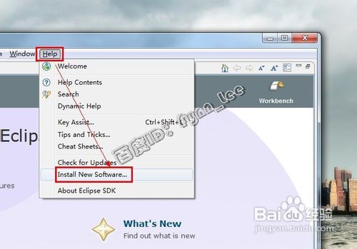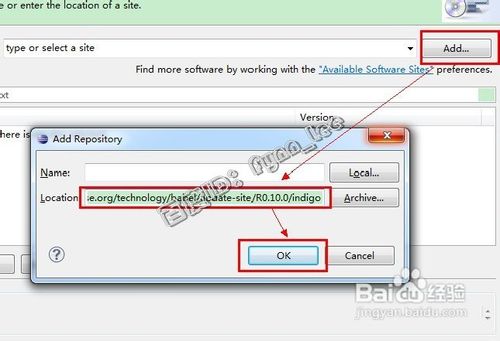 3. 打開eclipse,依次選擇菜單欄“Help - Install New Software...”,如圖所示,在打開的新窗口中點擊“Add”按鈕,然后在“location”文本框中輸入剛剛復制的網址,點擊“OK”按鈕即可。