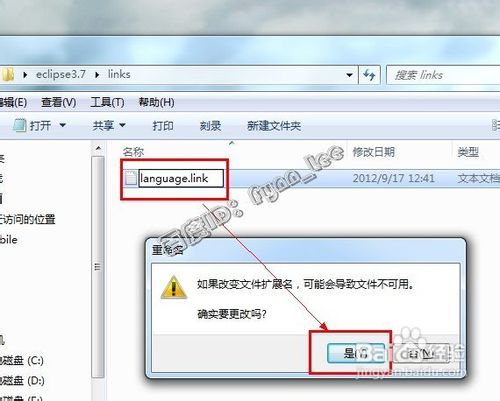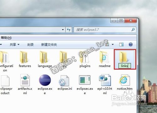 4.在eclipse安裝目錄的根目錄下新建links文件夾(和language文件夾在同一文件夾下)并打開此文件夾,然后在此文件夾下新建文本文檔,并將文本文檔的名稱連同擴展名一同修改為“language.link”文件名,如圖所示。