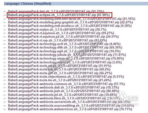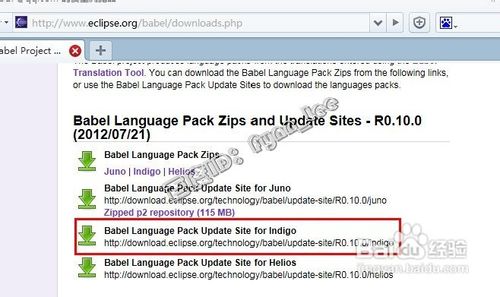1. 打開瀏覽器,瀏覽“參考資料”內給出的“eclipse語言包下載”地址,如圖所示。“Babel Language...”開頭的一欄下面就是各個eclise版本的語言包,此處以Indigo版為例。