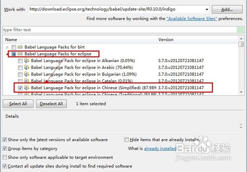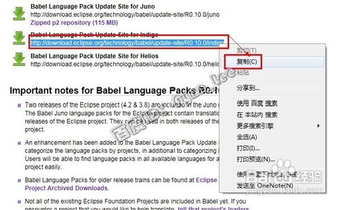 2. 目標鎖定“Babel Language Pack Update Site for Indigo”行,將下面對應的網址復制到剪貼板。