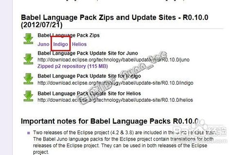 1. 仍然打開【參考資料】內給出的語言包下載地址,在頁面中點擊“Indigo”進入詳細語言包下載頁面,其他版本請點擊旁邊兩個“Juno”、“helios”。