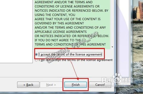 5.過幾秒中便跳到如下界面,仍然點擊“next”按鈕進入下一頁面,勾選第一個“I accept...”單選框,點擊“Finish”按鈕完成設置。