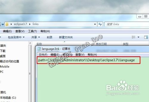 6.以記事本打開后,在記事本中編輯剛剛在eclipselanguage下放入的語言包的地址,并且用“”表示路徑,如圖所示,不要將文件夾language下的eclipse文件夾加到里面。