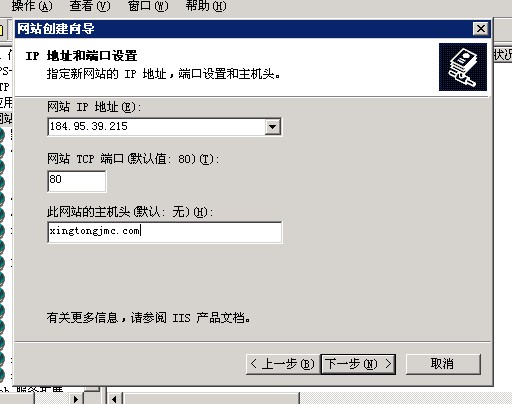 七:在網站IP里面填你的網站ip,網站主機頭寫不要www的域名。然后下一步