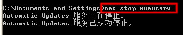 在“命令提示符”窗口中,輸入“net stop wuauserv”,然后按“Enter”鍵,停止 Automatic Updates 服務。如圖 2 輸入“net stop wuauserv”所示: