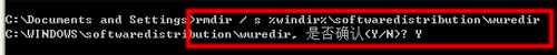 在圖 2 命令提示符下繼續(xù)輸入“rmdir / s %windir%softwaredistributionwuredir”,按“Enter”鍵。輸入“Y”,然后按“Enter”鍵。如圖 3 輸入“Y”所示: