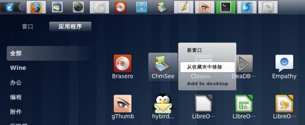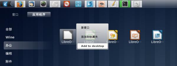 在“應(yīng)用程序”下,右鍵點(diǎn)擊任何一款應(yīng)用程序圖標(biāo),則會(huì)出現(xiàn)“新窗口”、“添加到收藏夾”、“添加到桌面”選擇項(xiàng)。原生GNOME Shell只支持前兩項(xiàng)。Deepin GNOME Shell新增“添加到桌面”選項(xiàng),通過此功能便將常用應(yīng)用程序添加到桌面,建立快捷方式。
