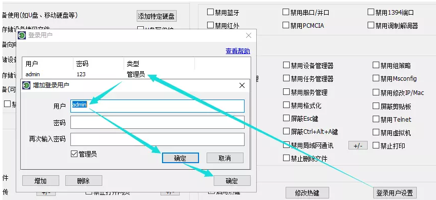 在下方點擊【登錄用戶設置】,彈出窗口,雙擊打開admin用戶,根據提示修改密碼,依次點擊確定,然后設置軟件在后臺運行。