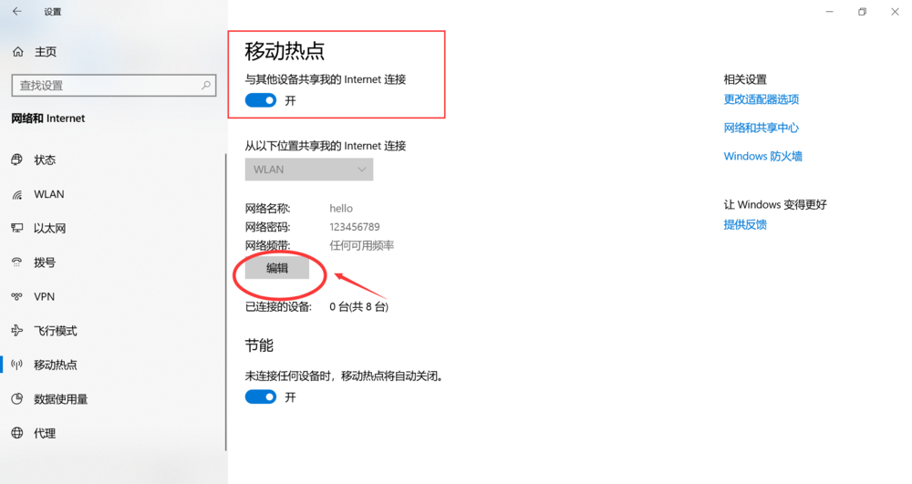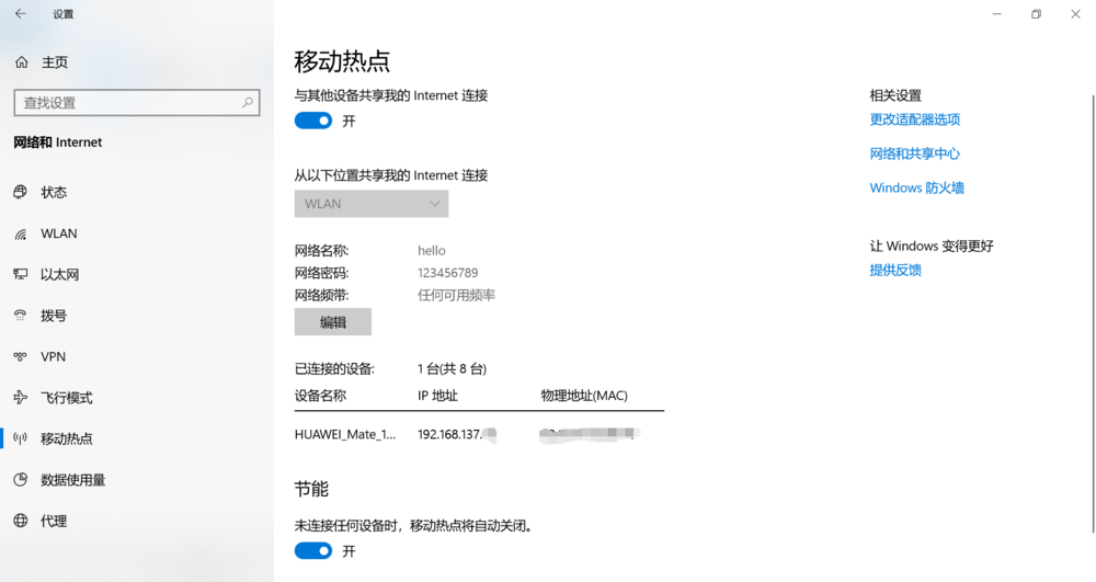 如圖,移動熱點功能默認是關閉的,現在將其打開,即可實現與其他設備共享Internet連接,