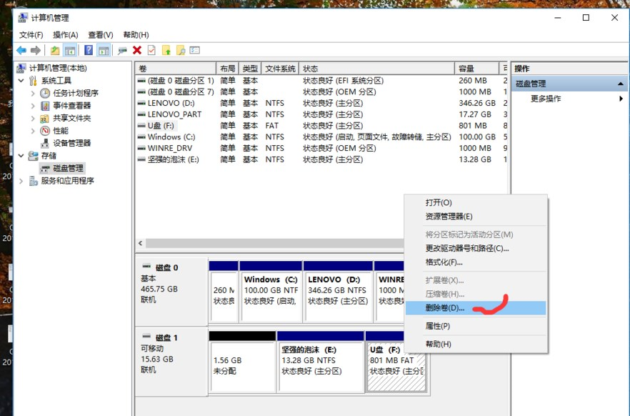 點擊【磁盤管理】,即可在右側窗口看到本電腦的磁盤分區以及大小信息,找到移動硬盤(找到要刪除的那個分區),鼠標右擊,選擇【刪除卷】,