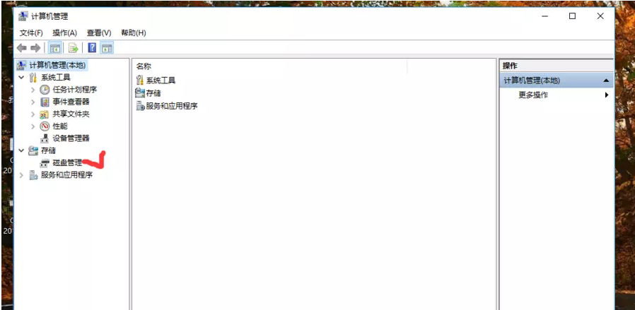 鼠標右擊【我的電腦】,彈出菜單,點擊【管理】,進入計算機管理界面,如圖,在左側點擊【磁盤管理】,