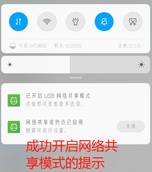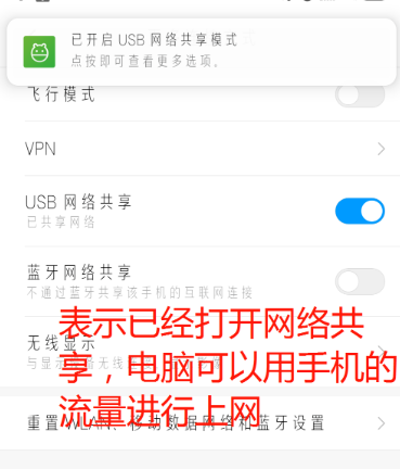 成功開啟網絡共享,手機中會有這兩個提示,而且電腦可以正常連網,如圖所示。