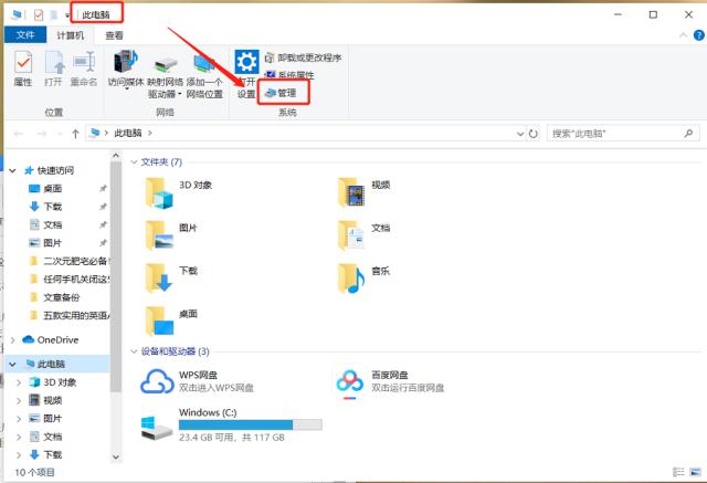 1、在桌面上點擊【此電腦】,進入窗口,點擊上方【計算機】選項,展開菜單,如圖,點擊【系統】——【管理】,
