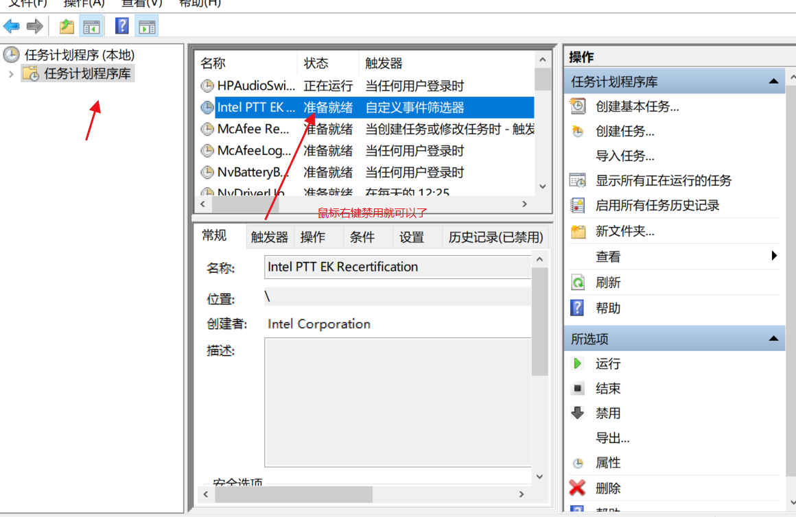 3、接著點擊左上角的【任務計劃程序庫】,然后在中間面板找到相關程序,鼠標右擊,直接進行禁用,