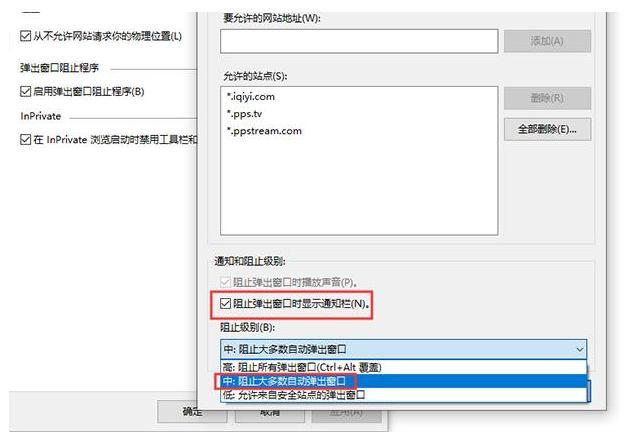 5、進入以下界面,先勾選【阻止彈出窗口時顯示通知欄】,然后將下方的【阻止級別】設置為【中阻止大多數(shù)自動彈出窗口】,最后點擊確定。