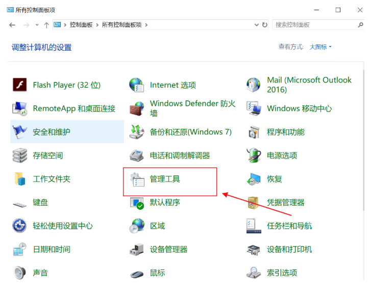 1、打開控制面板,如圖,設置【查看方式】為大圖標,然后點擊【管理工具】,