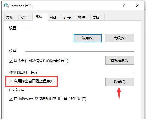 4、接著回到控制面板,點擊【Internet】選項,打開面板,如圖,切換【隱私】標簽,勾選【啟用彈出窗口阻止程序】,點擊【設置】,
