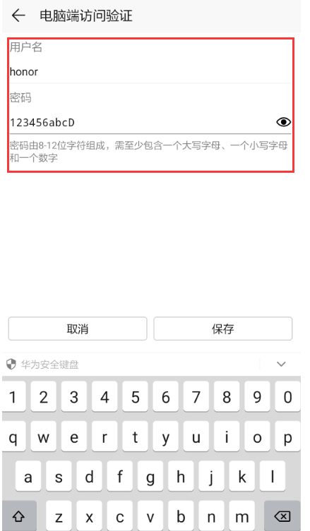 4、接著點擊【電腦端訪問驗證】,如圖,設置電腦端訪問手機的用戶名和密碼,這是為了保護手機安全,