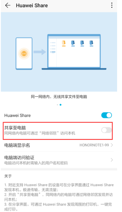 3、如圖,點擊打開【共享至電腦】,即可顯示華為手機設備名稱,如此一來,處于同一局域網的電腦即可搜索訪問你的手機,