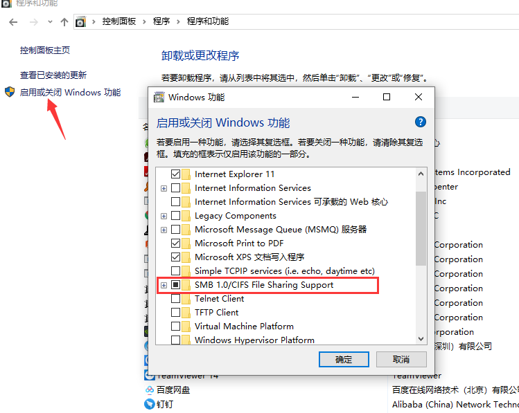 5、在電腦端打開控制面板,點擊【程序】——【卸載程序】,進入以下界面,然后點擊左側的【啟用和關閉Windows功能】,在窗口中勾選【SMB1.0文件共享支持】,確定,重啟電腦,