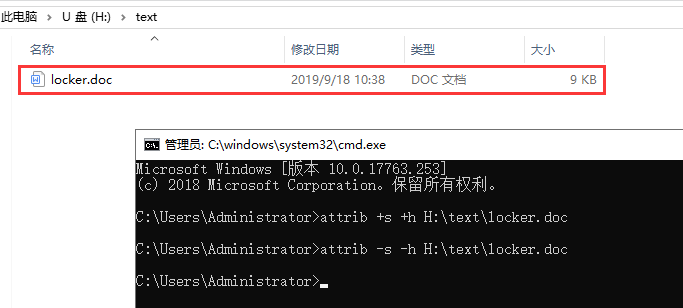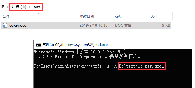 如果你現在需要查看隱藏文件,同樣打開命令行,輸入【attrib -s -h H:/text/locker.doc】,回車,即可顯示文檔,