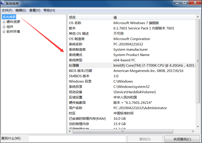 2、進入系統信息界面,點擊右側的【系統摘要】,即可顯示電腦配置信息,點擊【硬件資源】、【組件】、【軟件環境】,可以查看電腦系統的其他信息。