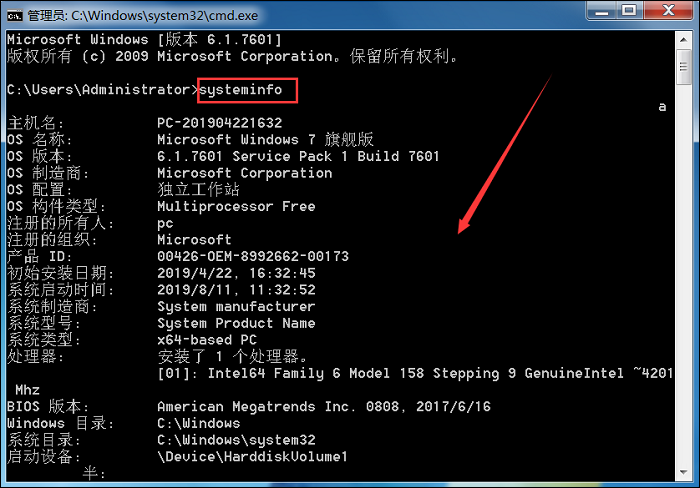2、如圖,在紅色框的位置輸入systeminfo,點擊回車,即可在當前頁面中查看電腦配置信息。