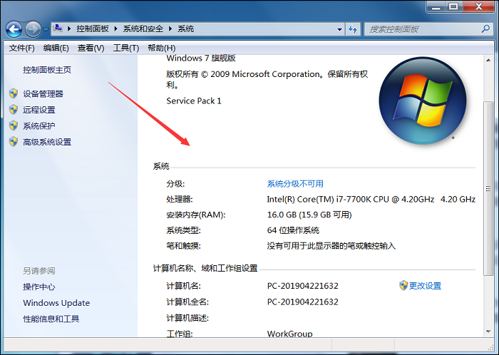 2、進入以下界面,你就可以看到當前使用電腦的基本信息,包括處理器、內存、系統類型等等。
