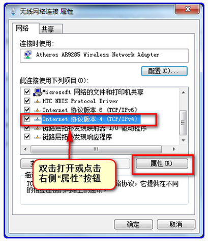3、鼠標右擊【無線網絡連接】,選擇屬性,彈出窗口,如圖,雙擊【 internet協辦議版本4( TCP/IPy4)】,或者點擊右側的【屬性】按鈕,