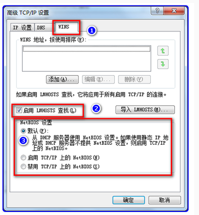 5、如圖,點擊WNS選項卡,勾選【啟用 LMHOSTS查找】,點擊【NetBIos設置】,勾選默認選項或者【啟用 TCP/IP上的 NetBios】,點擊確認,