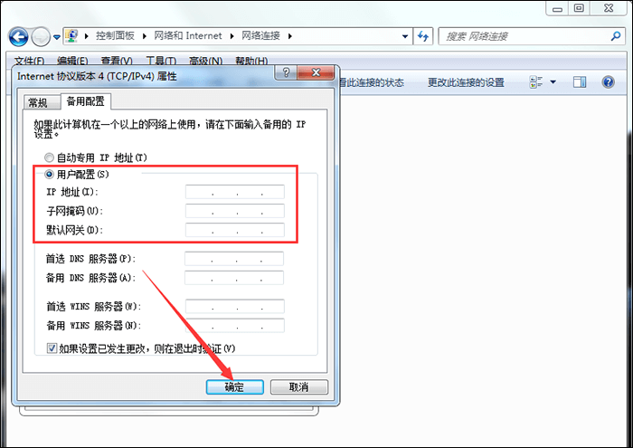 6、當然了,你也可以切換【備用配置】選項,勾選【用戶配置】,修改IP地址,最后點擊確定即可。