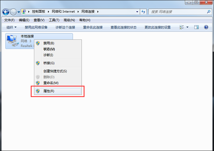 3、進入網絡連接窗口,使用鼠標右擊【本地連接】,彈出菜單,點擊【屬性】選項,