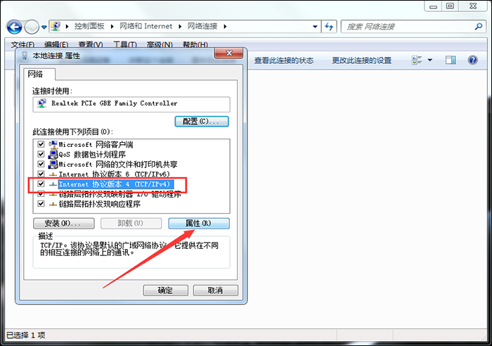 4、打開本地連接屬性窗口,點擊勾選【Internet協議版本4】,接著點擊【屬性】,如圖,