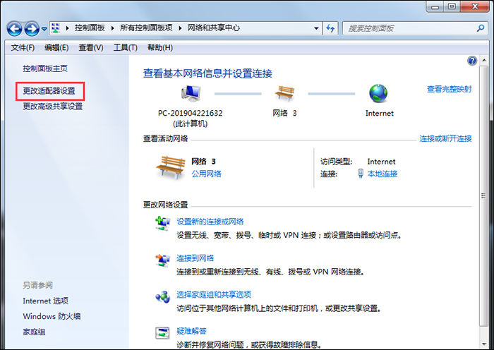 2、進入網絡和共享中心界面,在左側點擊【更改適配器設置】,如圖,