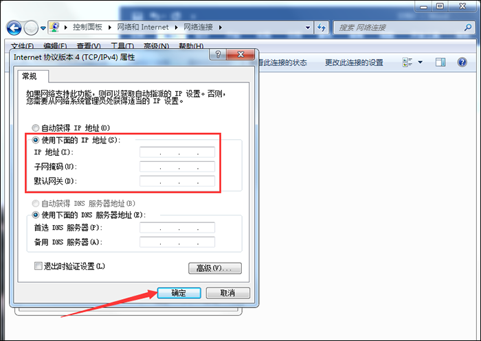 5、勾選【使用下面的IP地址】,然后在IP地址、子網掩碼、默認網關中設置IP地址,點擊確定就可以了,