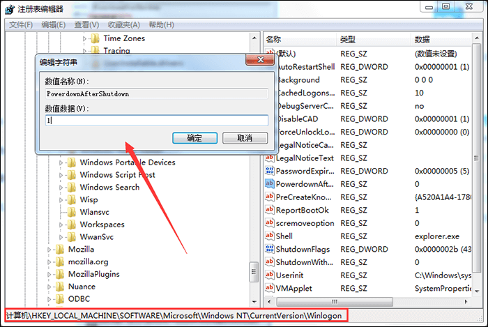 2、打開注冊表編輯器,依次點擊HKEY_LOCAL_MACHINE/SOFTWARE/Microsoft/Windows NT/CurrentVersion/Winlogons,右擊PowerdownAfterShutdown,修改其數(shù)值數(shù)據(jù)為1,點擊確定即可。