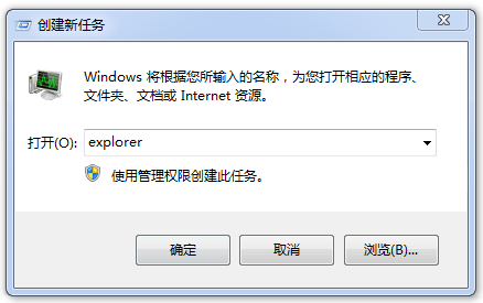 彈出窗口,創(chuàng)建新任務(wù),輸入explorer,點(diǎn)擊確定,即可顯示桌面圖標(biāo)。