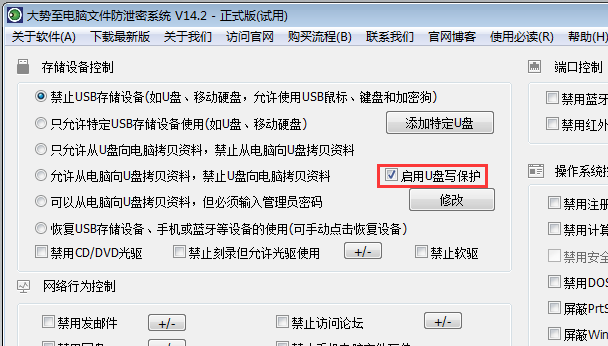 進入軟件主界面,點擊【存儲設備控制】——【啟用U盤寫保護】,進行勾選,