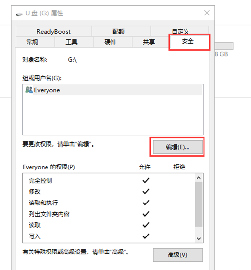 進入U盤屬性界面,如圖,點擊【安全】——【編輯】選項,
