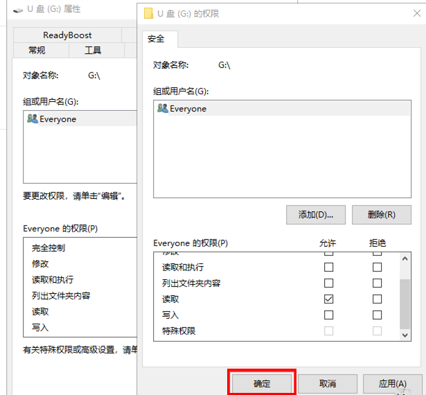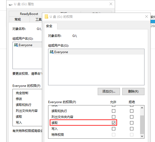 進入U盤權限界面,選擇Everyone用戶,然后點擊下方的【Everyone的權限】——【讀取】,勾選【讀取】,