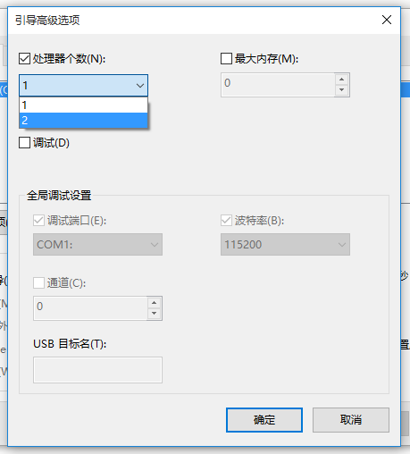4、然后依次點擊【引導】——【高級選項】,打開引導高級選項窗口,勾選【處理器個數】,設置最大數字,小編這里是2,點擊確定,