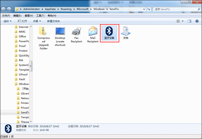 在【開始】菜單欄搜索shell:sendto,打開其所在的文件夾,接著將桌面上的fsquirt.exe應(yīng)用程序添加到文件夾,重命名為【藍(lán)牙設(shè)備】即可。